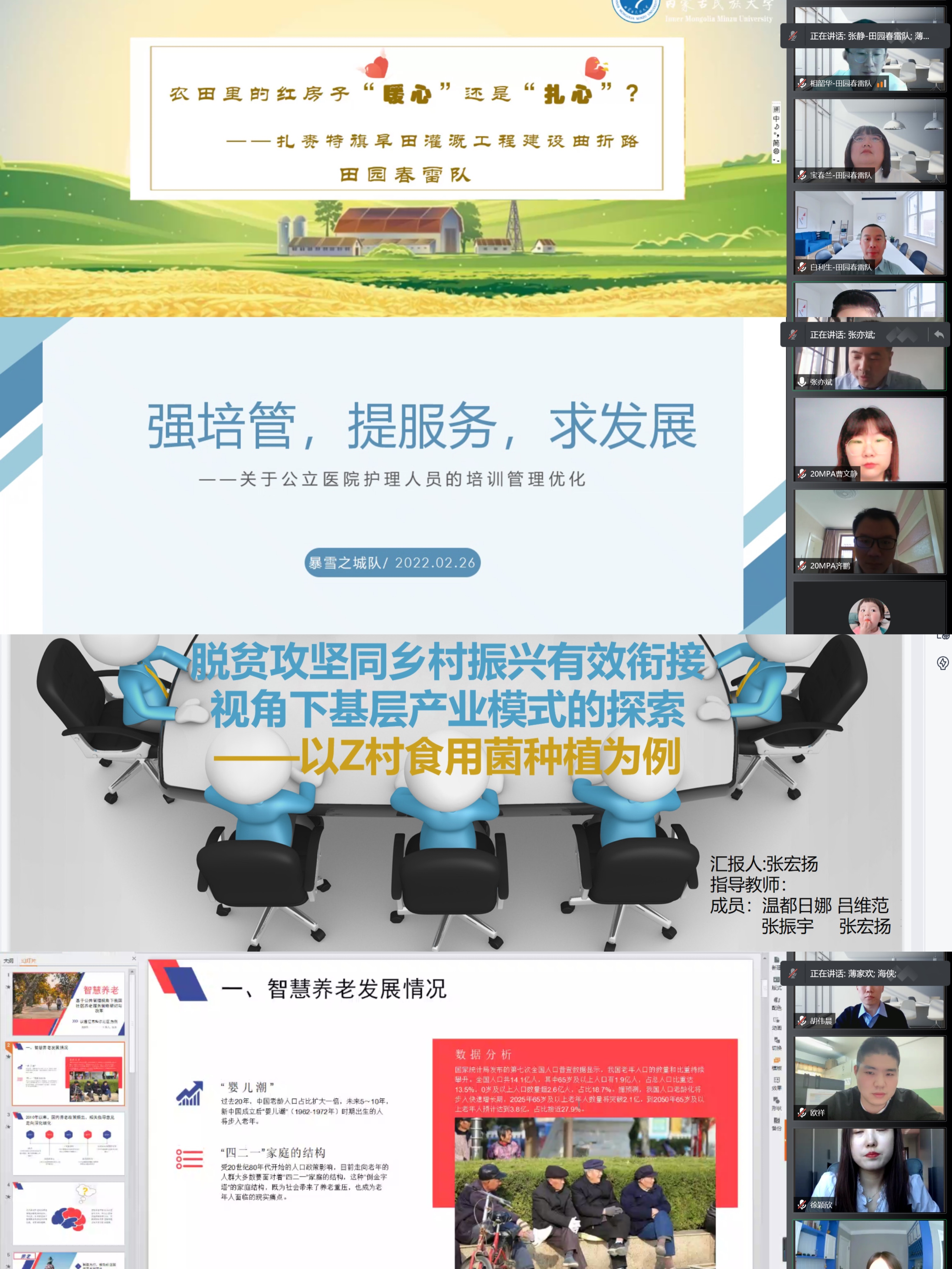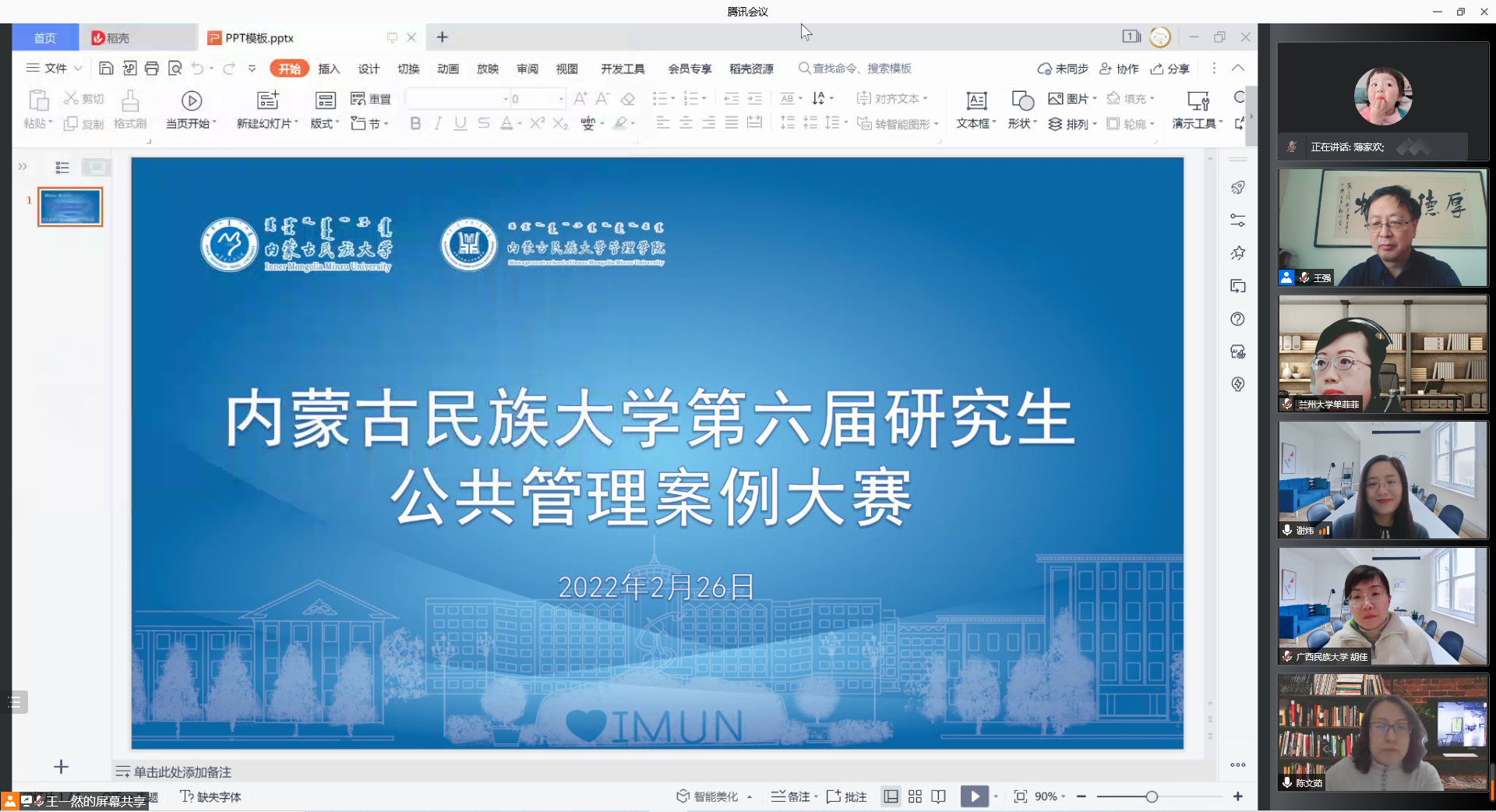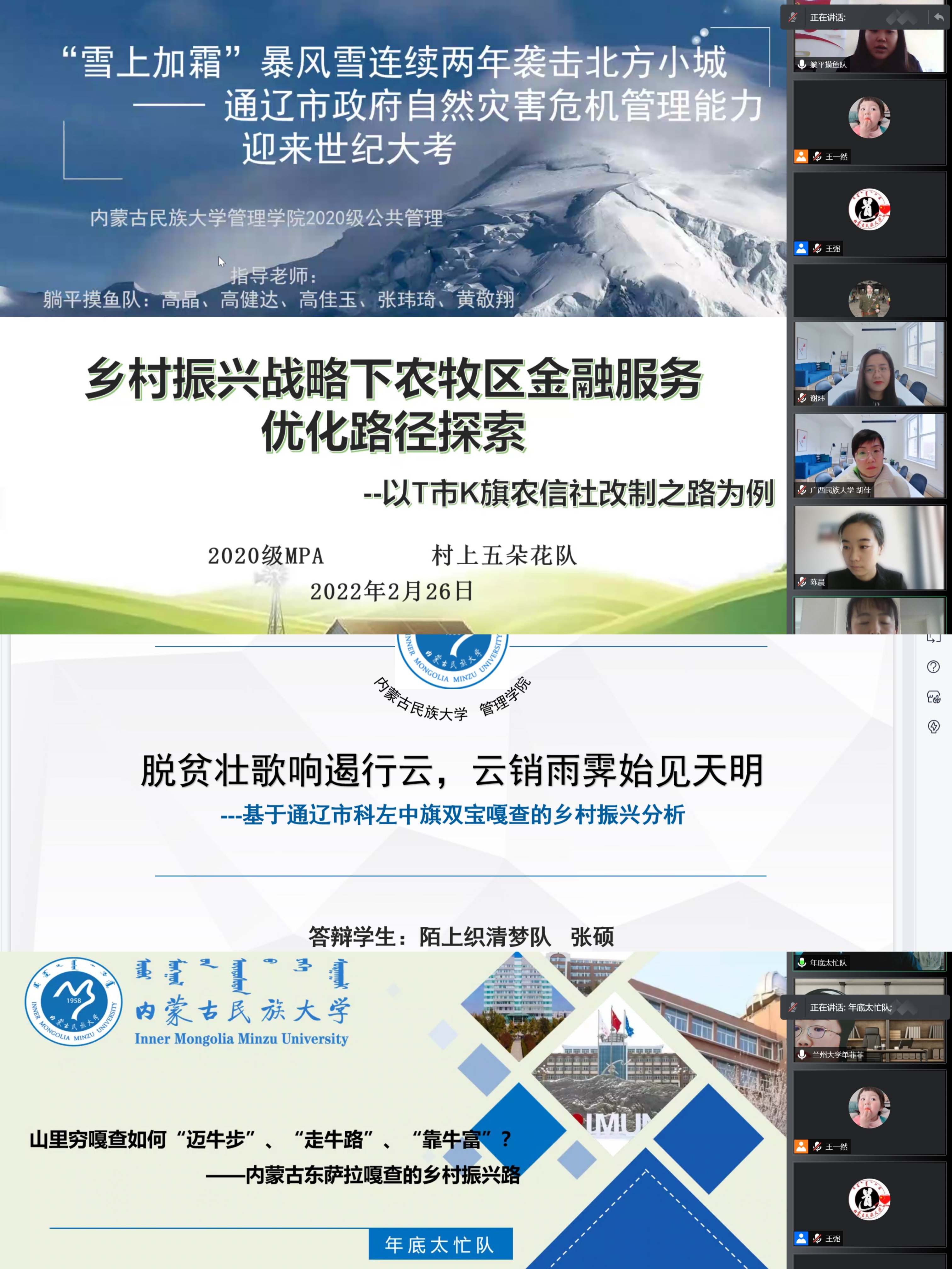 2月26日上午,管理学院通过腾讯线上会议举行“第六届MPA研究生公共管理案例大赛”,兰州大学管理学院单菲菲教授、广西民族大学政治与公共管理学院胡佳教授、华东师范大学公共管理学院谢炜教授、管理学院院长王强教授、行政管理系主任陈文茹副教授担任专家评委。2020级MPA研究生8支队伍参赛,我校MPA研究生导师及2021级MPA研究生观摩比赛。