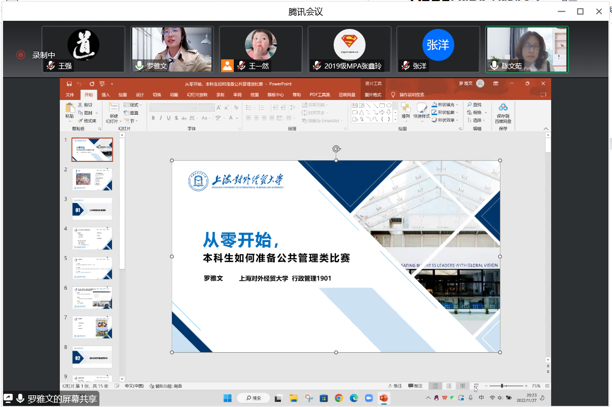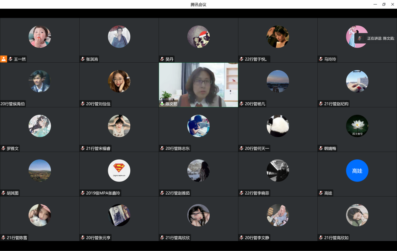 11月27日晚上,管理学院通过腾讯会议举办“公共管理论坛系列讲座”第三十一讲,本次讲座的主题为“以赛促学,公共管理案例的参赛经验”,邀请2020届MPA毕业生吴丹和赵冰莹、2022届MPA毕业生张鑫玲以及上海对外经贸大学2019级行政管理专业本科生罗雅文分享参加公共管理案例大赛的案例编写体会和参赛经验。学院公共管理相关专业教师、MPA在读研究生、行政管理专业本科学生180余人参加,讲座由行政管理系主任陈文茹主持。