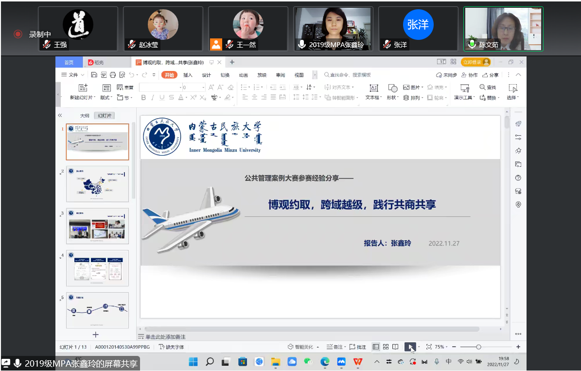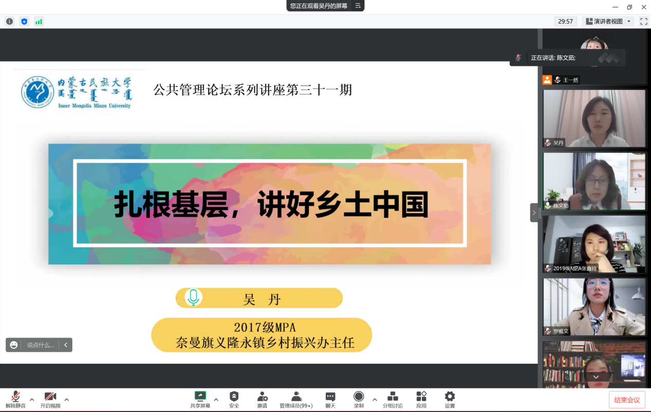 现任奈曼旗义隆永镇政府乡村振兴办主任吴丹以“扎根基层,讲好乡土中国”为主题,结合入围第三届中国研究生公共管理案例大赛32强获得三等奖的案例,在选材、多看、调研、撰写四个阶段分享了案例撰写经验。刚刚考录入编内蒙古民族大学教师赵冰莹以“选择MPA,遇见更好的自己”为题,结合两次案例大赛和一篇入库案例,分享了公共管理案例的编写经验和成果收获,指出一个好的案例应具有主线清晰、逻辑严谨和内容详实三个特点。现任退役军人事务部主任科员张鑫玲以“博观约取,跨域越级,践行共商共享”为题,从选题、资料收集、案例编写、参赛等多个方面介绍了参加首届自治区和华北地区MPA研究生公共管理案例大赛的心得体会,总结出要注重队内沟通交流、重点选题领域和团队分工协作三个方面。罗雅文同学以“从零开始,本科生如何准备公共管理类比赛”为题,分享了参加“哲寻杯”高校公共管理案例大赛和清华大学中国公共政策案例分析大赛的参赛感悟,在本科生如何组队、怎样选题和打磨案例方面给出了有针对性的建议,并鼓励同学们克服困难,勇于尝试,在备赛过程中认真准备,投入热情,多与组员和老师沟通交流。