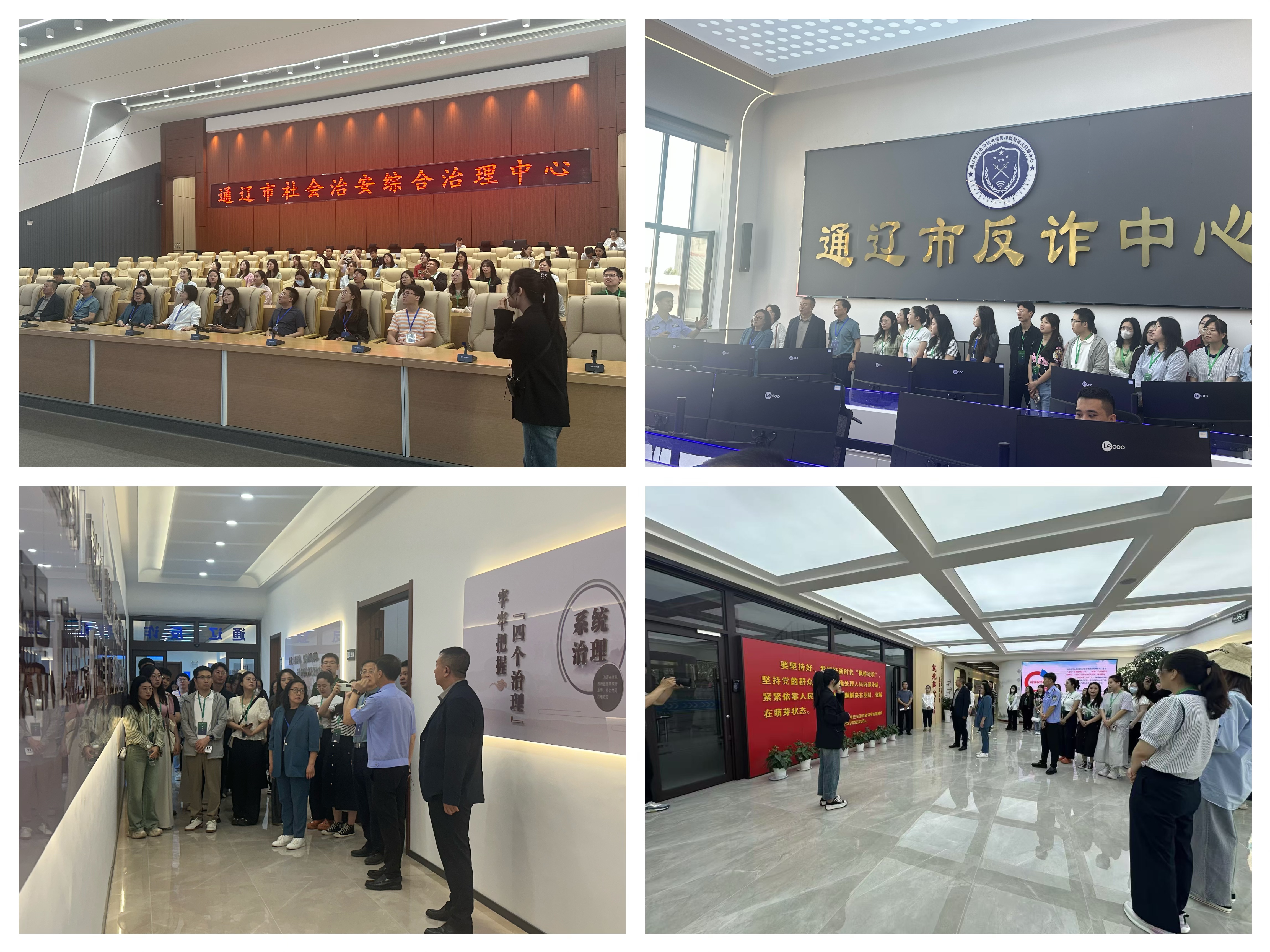在通辽市社会治安综合治理中心,参观了市社会治安综合治理中心接待大厅、心理咨询室、公共法律服务室、矛盾纠纷调解室、司法确认室、医疗事故鉴定室、“雪亮工程”视频监控室、市反诈中心、市法学会、政法融媒体中心等处,实地了解了综治中心机构设置、人员配备、单位入驻、运行机制、化解模式、实战成效等方面情况。从‘茶桌调解会’到‘数字乡村’监控平台,通辽实践展现了基层治理的‘精细化’与‘智慧化’结合,对市域治理现代化具有重要借鉴意义,也让学生们深刻感受到基层治理“平安密码”背后的实践智慧。