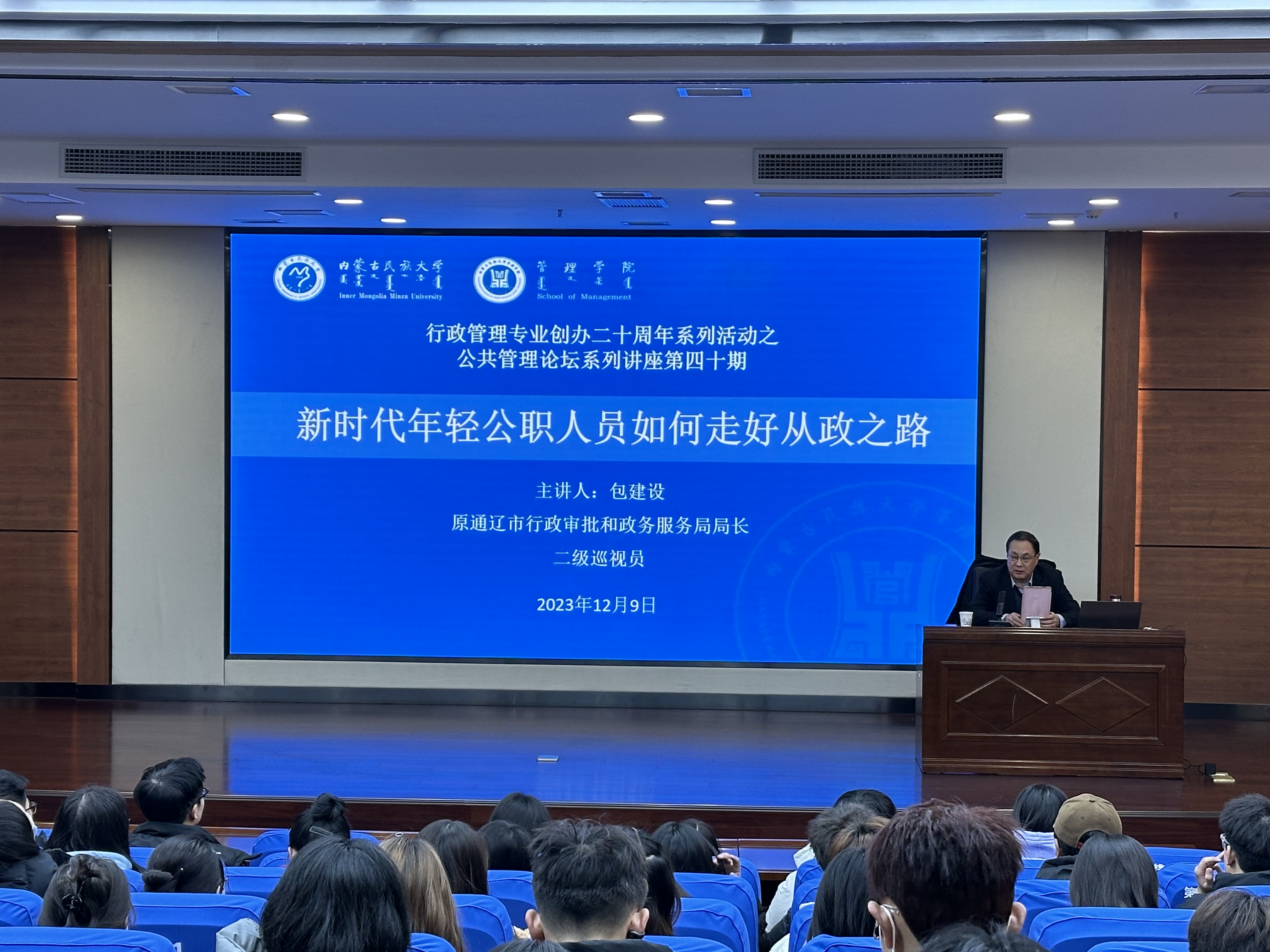 为切实服务学生实际需求,充分发挥MPA行业导师作用,保障学生在职场中走好“第一步”,12月9日,管理学院开展行政管理专业创办二十周年系列活动--“公共管理论坛系列讲座第四十期”,邀请我校公共管理硕士(MPA)专业学位行业导师、原通辽市行政审批和政务服务局局长、二级巡视员包建设作题为《新时代年轻公职人员如何走好从政之路》专题讲座。行政管理专业相关教师、全体公共管理专业研究生、21级、22级、23级行政管理专业部分本科生100余人参加讲座。讲座由王强院长主持。